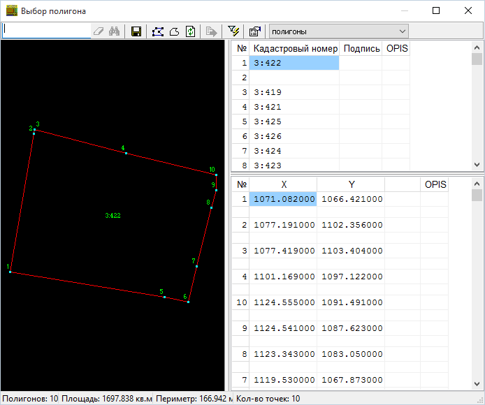 Здесь производится корректировка кадастрового номера, подписи, а также выбор полигона.
